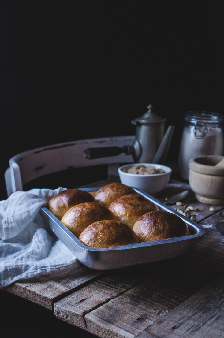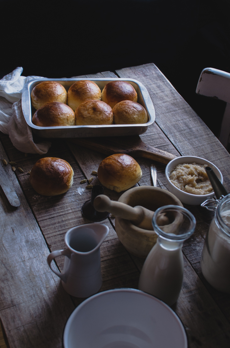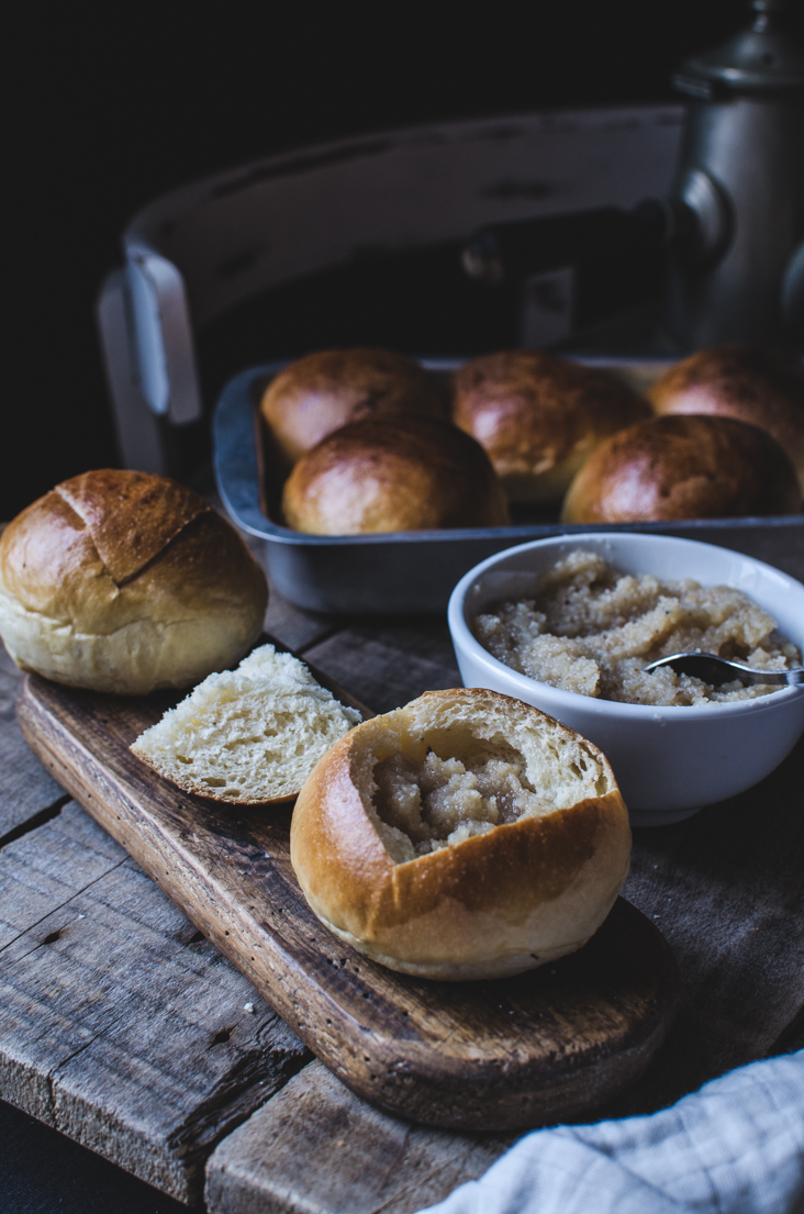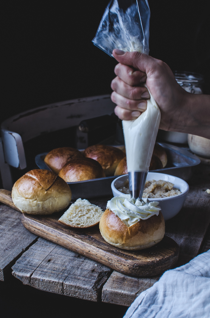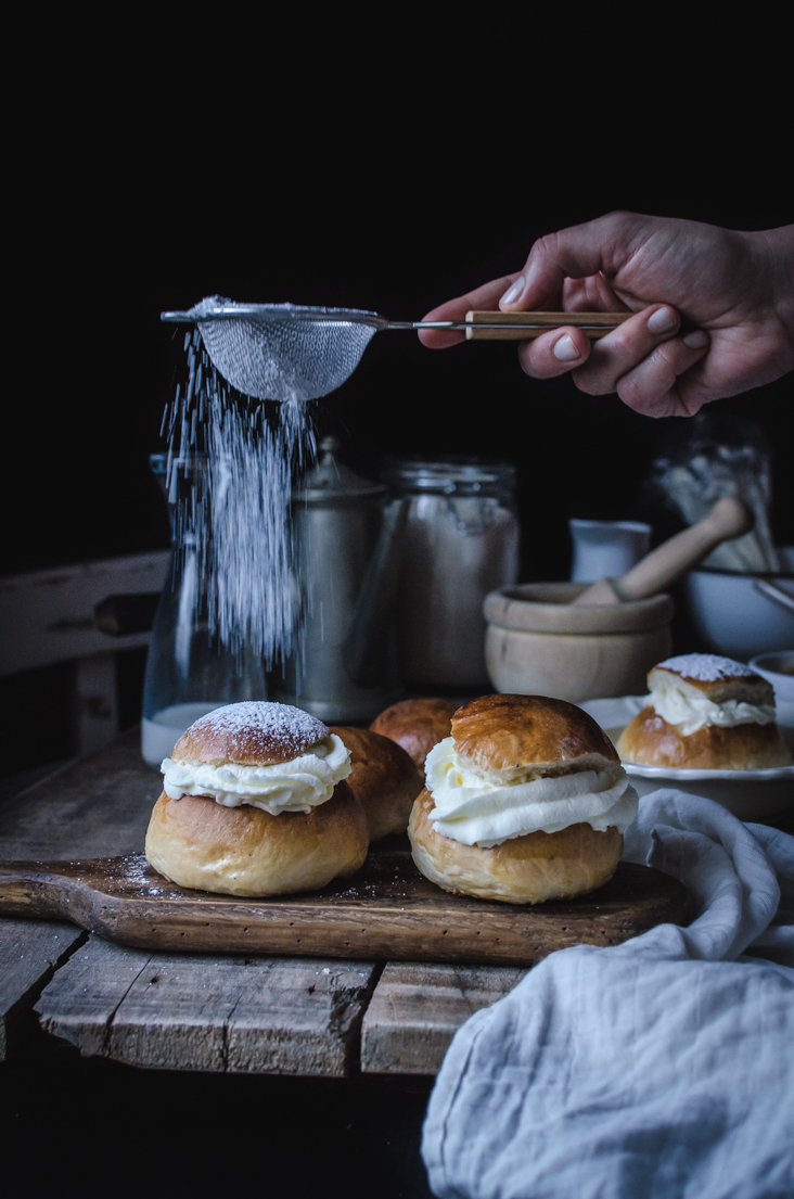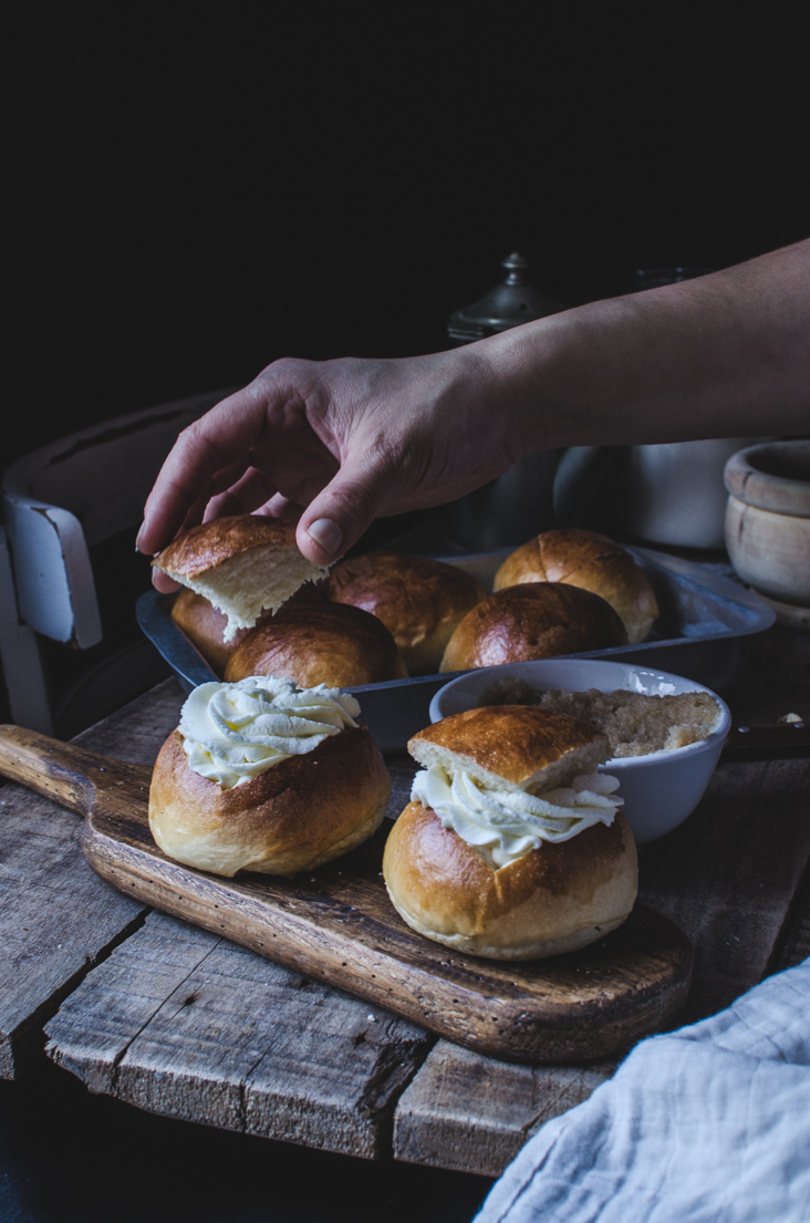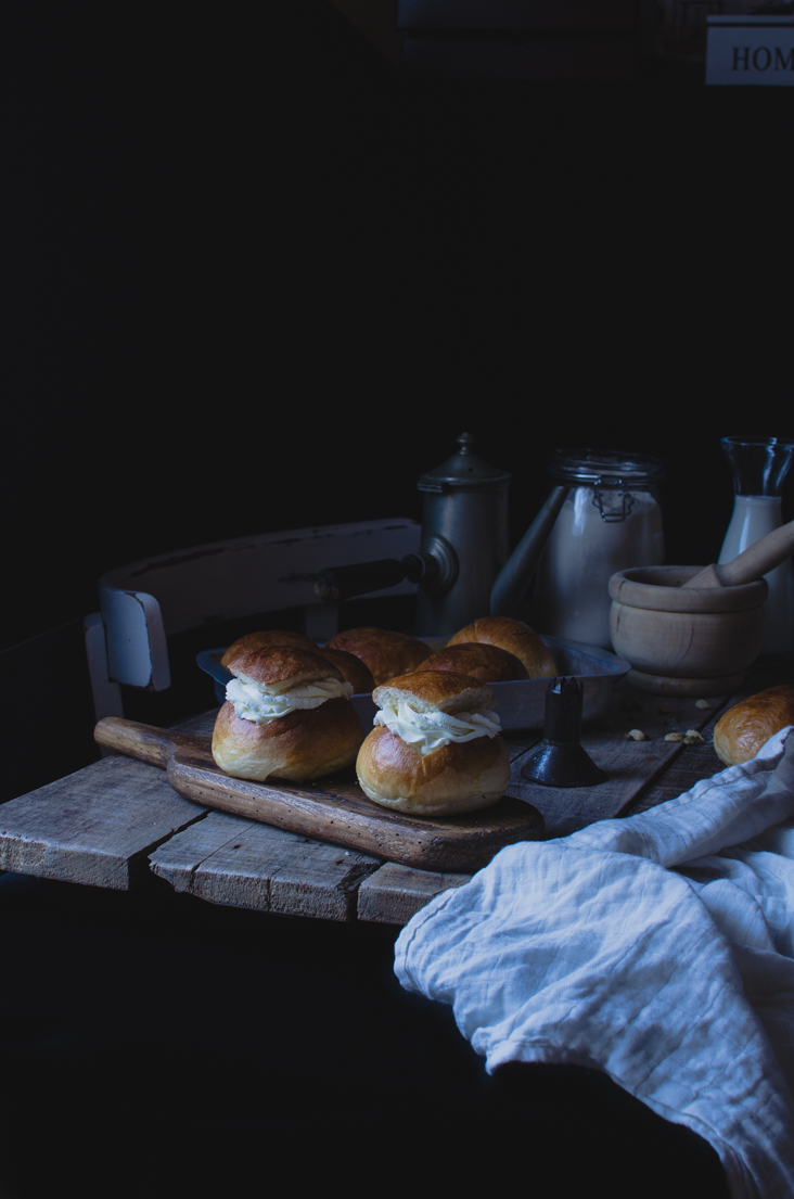 Se trata de los semlor, unos deliciosos bollitos típicos de Cuaresma, con una masa aromatizada con cardamomo y un relleno de mazapán y nata…Puro vicio!!