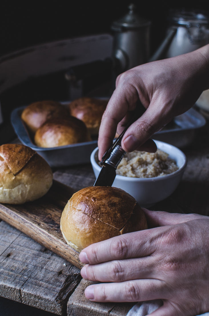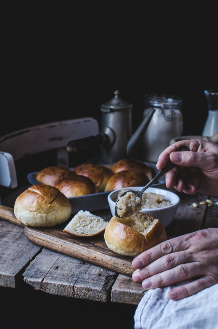 Una vez fríos cortamos la tapa a los bollos (la manera más tradicional de hacerlo es en forma triangular o en círculo), quitamos un poco de la miga y rellenamos cada bollo con una cucharada de la mezcla de mazapán que teníamos reservada.